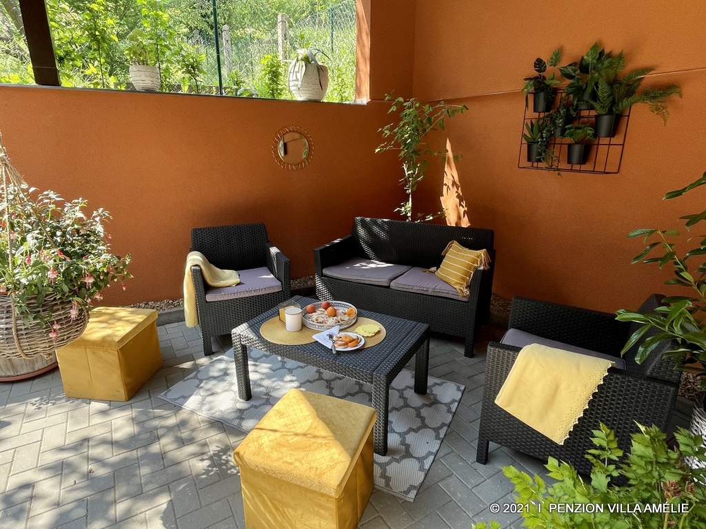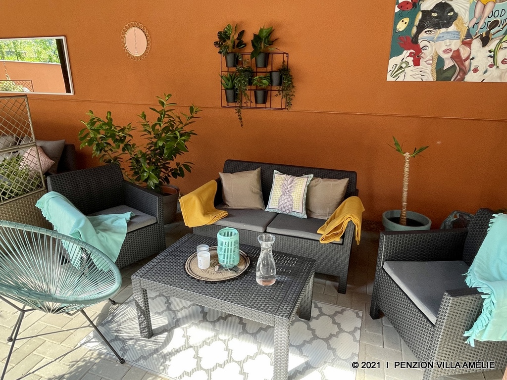 The peaceful atmosphere is enhanced by a garden with fruit trees and a large terrace with outdoor seating and home-cooked meals. In the basement there is Boutique Amy with love, so you can enjoy not only home design but also fashion.