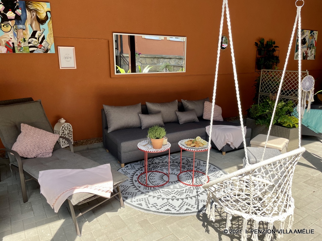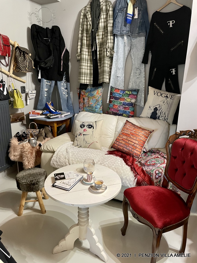 The peaceful atmosphere is enhanced by a garden with fruit trees and a large terrace with outdoor seating and home-cooked meals. In the basement there is Boutique Amy with love, so you can enjoy not only home design but also fashion.