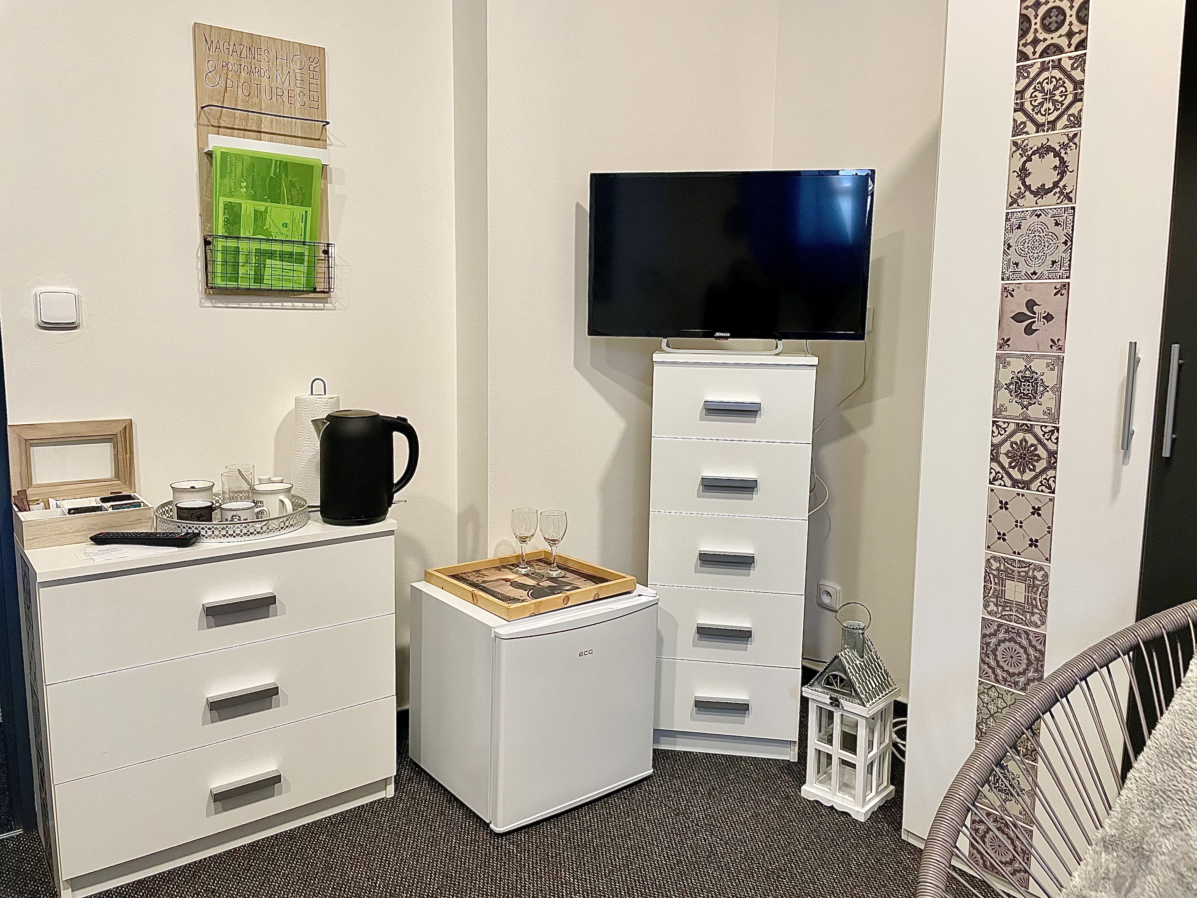 Cozy fully equipped room in boho style with free wifi connection and private balcony. The room has a minibar, an electric kettle, a varied selection of teas and coffees, TV, a shower, a hairdryer, slippers and a range of cosmetic samples. Breakfast of your choice is served directly in the room or you can use the reception area.
