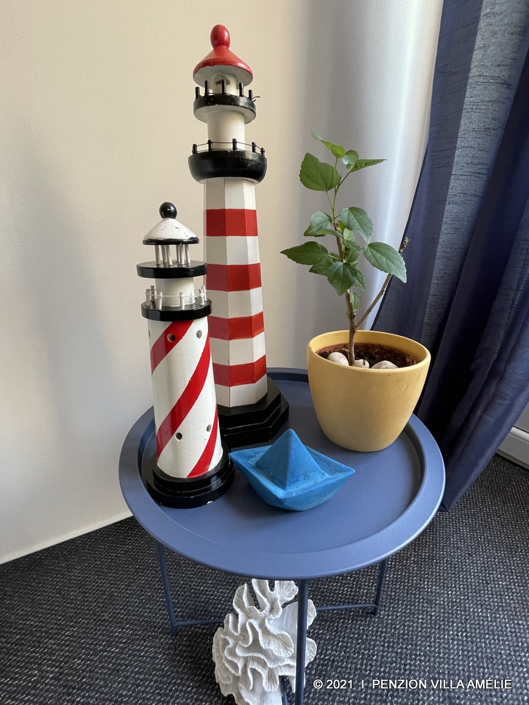Spacious fully equipped room in nautical style with free wifi connection and separate entrance to the garden. The room has a minibar, an electric kettle, a varied selection of teas and coffees, TV, a shower, a hairdryer, slippers and a range of cosmetic samples. Breakfast of your choice is served directly in the room or you can use the reception area.