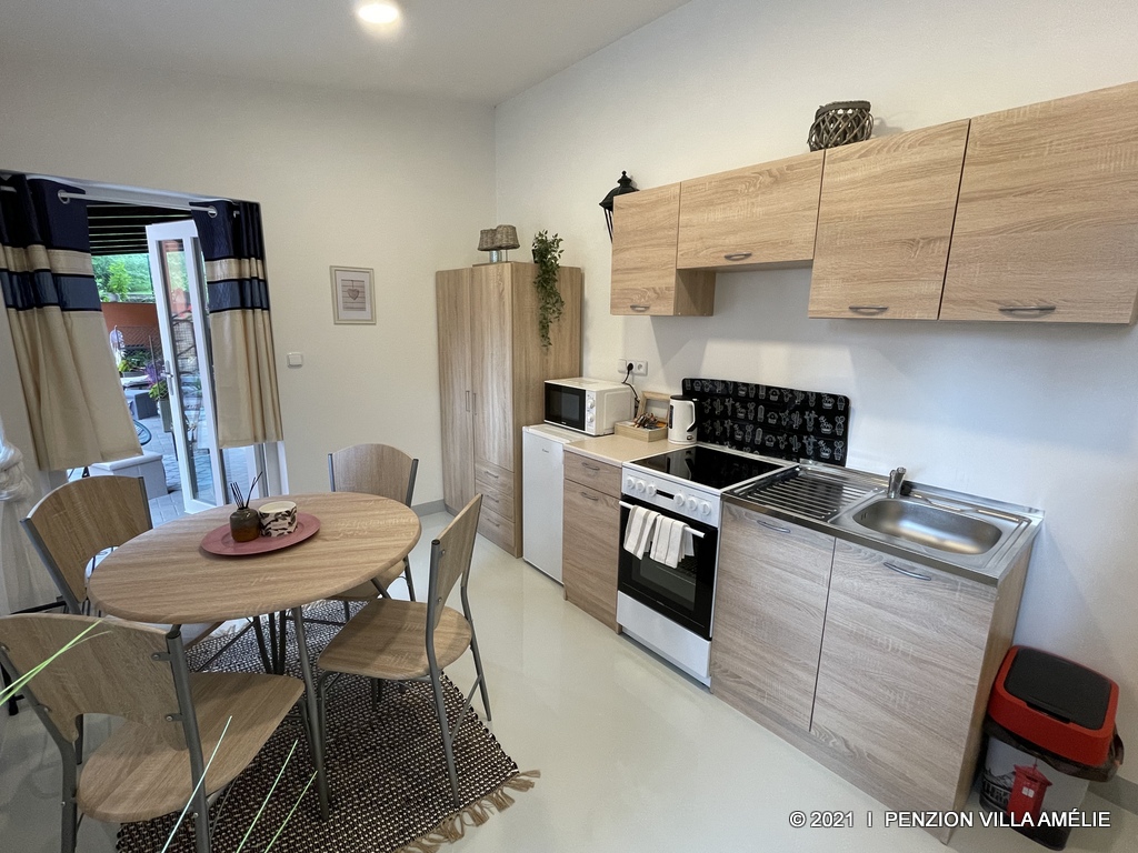 Spacious fully equipped separate apartment with its own kitchen and dining room. Entrance directly to the terrace. Free wifi connection. The couch in the living area can be unfolded to create another bed. The apartment has an equipped kitchen, minibar, an electric kettle, a varied selection of teas and coffees, TV, a bathtub, a hairdryer, slippers and a range of cosmetic samples. Breakfast of your choice is served directly in the room or you can use the reception or terrace area.