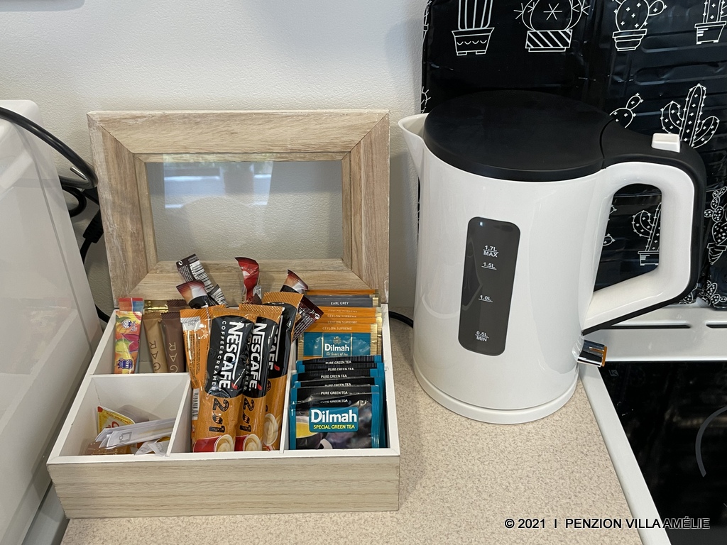 Stylish fully equipped room with free wifi connection. The room has a minibar, an electric kettle, a varied selection of teas and coffees, TV, a shower, a hairdryer, slippers and a range of cosmetic samples. Breakfast of your choice is served directly in the room or you can use the reception area.
