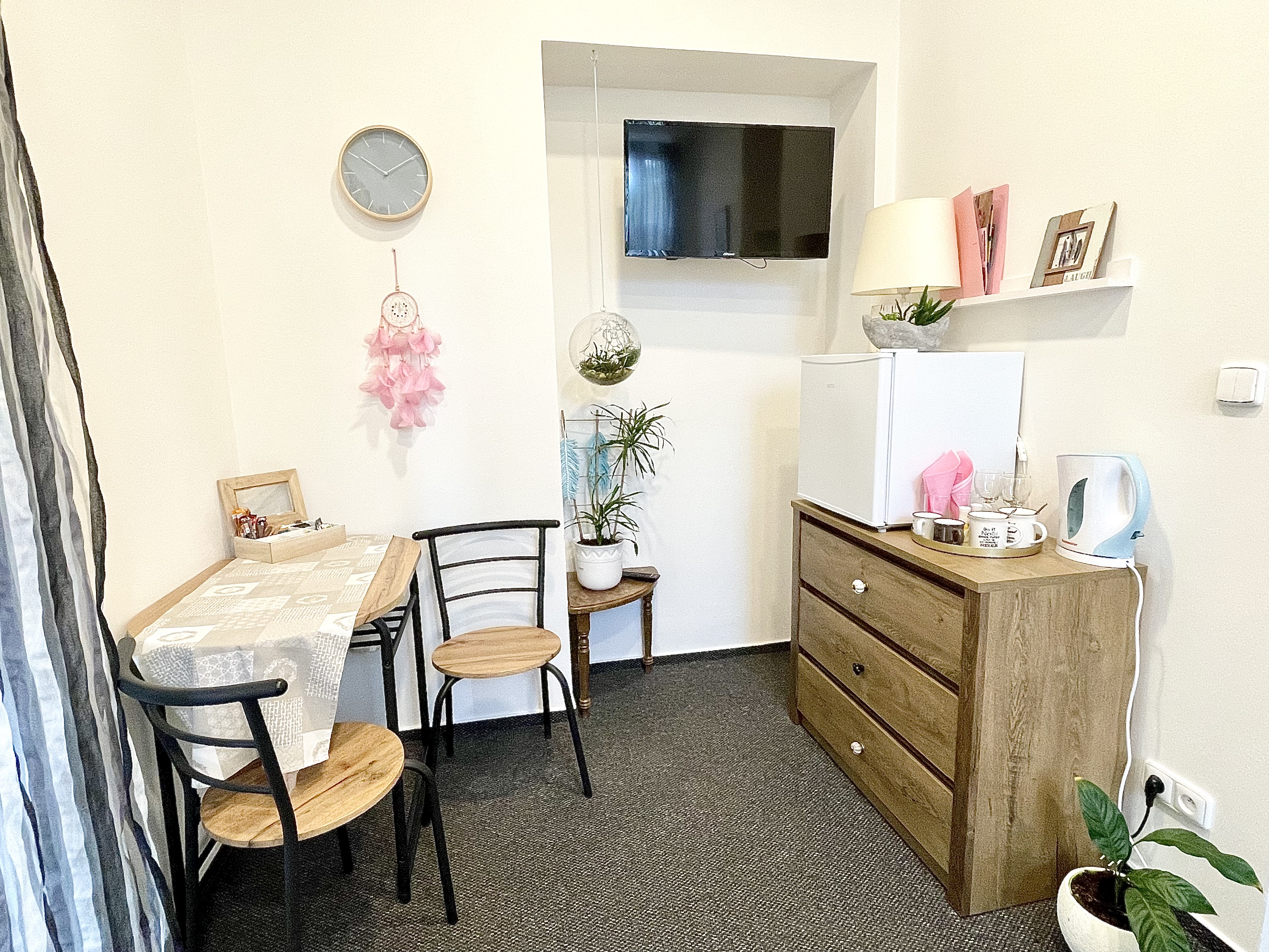 Cozy fully equipped room in boho style with free wifi connection and private balcony. The room has a minibar, an electric kettle, a varied selection of teas and coffees, TV, a shower, a hairdryer, slippers and a range of cosmetic samples. Breakfast of your choice is served directly in the room or you can use the reception area.
